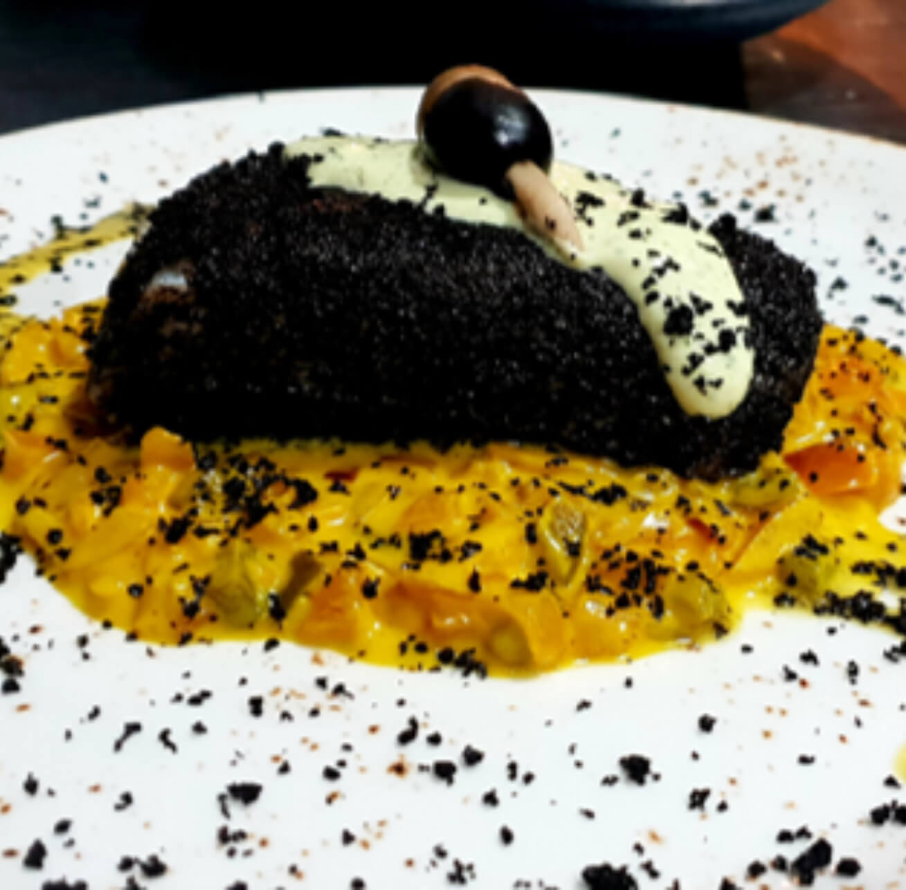 Bacalao a baja temperatura envuelto en tierras de aceituna Cacereña, sobre sofrito de pimiento dulce y setas salvajes con un toque suave alioli verde de aceitunas Gordal.